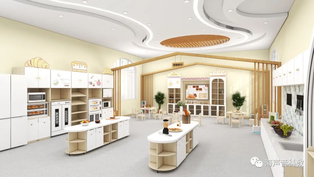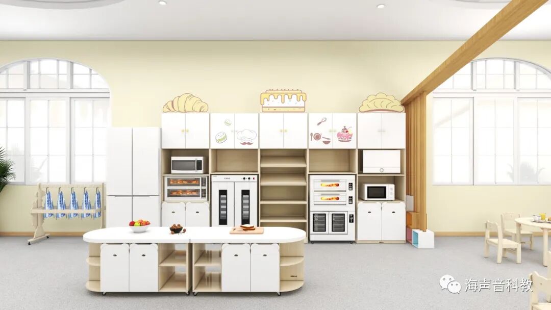 民以食为天,农业一直是我国经济命脉所在。开设烘焙教室不仅可以有效提高幼儿对于食物、营养和健康的认知水准,同时,通过亲自动手参与食物食材的准备和烹饪,也可以有效提高幼儿的动手实践能力和生活自理能力,并以此增强幼儿对于食物的敬畏和尊重之心。准备区便是幼儿参与食物准备和加工学习的活动区域。在这里他们可以学习简单的食物制作技巧,如洗菜、剥皮、搅拌、拌匀等。教师或指导员可以向幼儿讲解食材的属性和处理方法,引导他们探索食物的不同味道、质地和颜色。通过亲身参与食物准备的过程,幼儿能够增强对食物的认知和理解,培养动手能力和创造力。烘焙区作为幼儿观摩和练习的特殊区域,教育设备和家具的选用以及位置层级设计对于幼儿的安全保护至关重要。操作台材质为打磨光滑圆润的大理石面板,以最大程度减少儿童因追逐玩耍而造成的磕碰伤害,并为教师后续清洁打理工作提供了便利。操作台选用了可移动设计,台上可放置电磁炉、搅拌器、模具等设备,极大程度方便了教师教导儿童如何测量食材、搅拌混合材料等学习内容。在展示区,可以设置各种展示桌、展示柜、展示架等展示装置,用来陈列展示食物、餐具、烹饪器具、食谱、食物模型和相关的图书等。